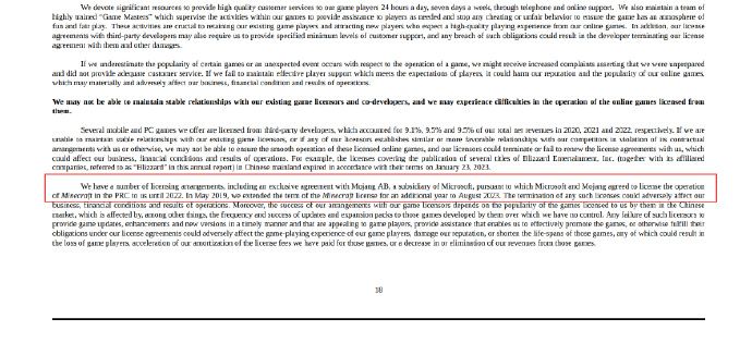 网易发布2022年度财报,其中关于《我的世界》国内代理的部分并未更新,依旧是“授权至2023年8月”