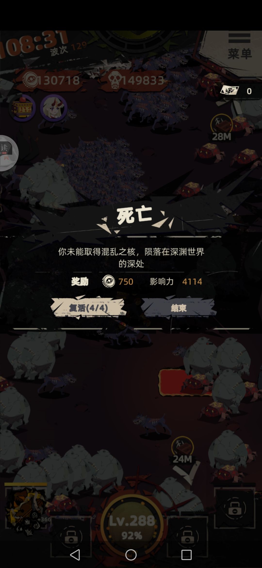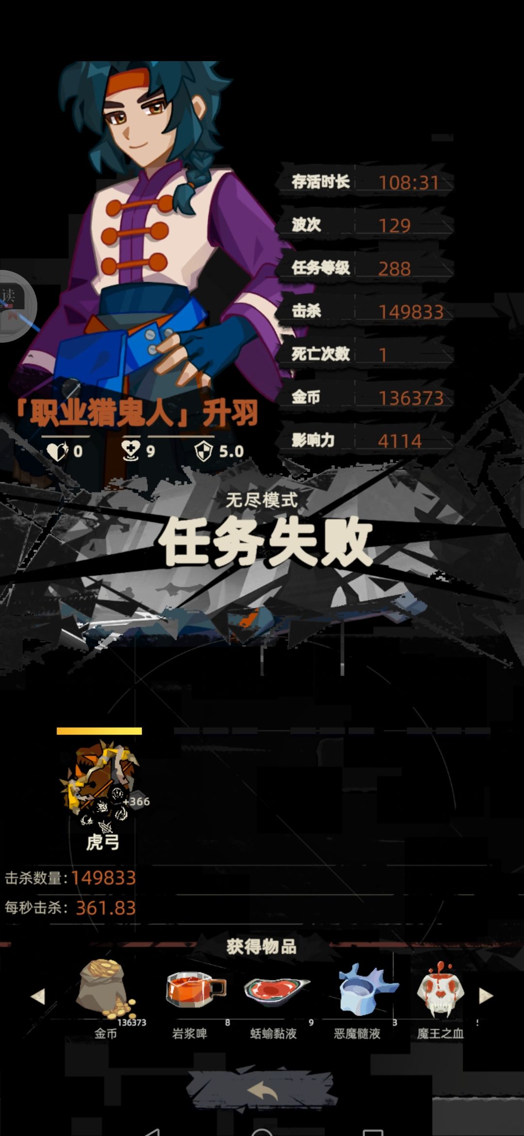 108分钟金币13.6W,黑屏卡死3次,手机顶不住了,不玩了,友情提示,花里胡哨的配件不要选,感觉不划算吧,在打我可能试着用薇紫鱼,提前把不想用的配件禁止了
