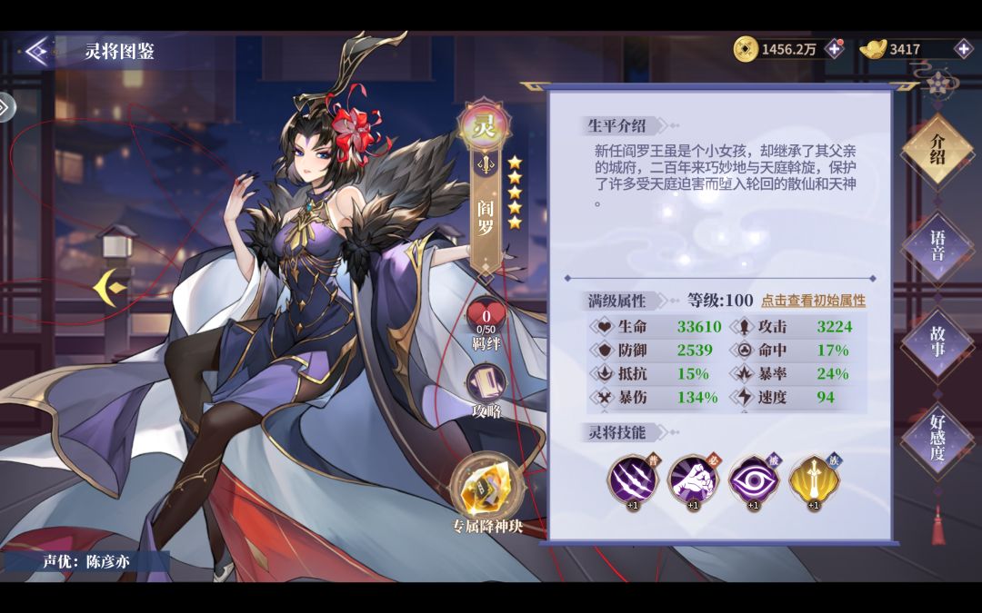 必杀技:生命抽离,目前阎罗的特色技能,只此一个灵将拥有,阎罗对敌方单体造成的伤害的百分之35会被视作体力流失,简单举例,阎罗的必杀技对血量10000的敌人造成了5000的伤害,那么敌人将流失35%的伤害量,即敌人的血量上限变为10000-5000×0.35=8250,这一特性做的很有趣,但是在PVP中很难发挥作用,相比于单体的体力流失,群里的禁疗效果会好更多,因为目前春秋封神的版本基本将回合数锁定在两回合以内,而阎罗的必杀技需要多次释放才能产生效果,因此我们不能说这次的创新是一次失败,只能说他并不适合于目前的环境版本。