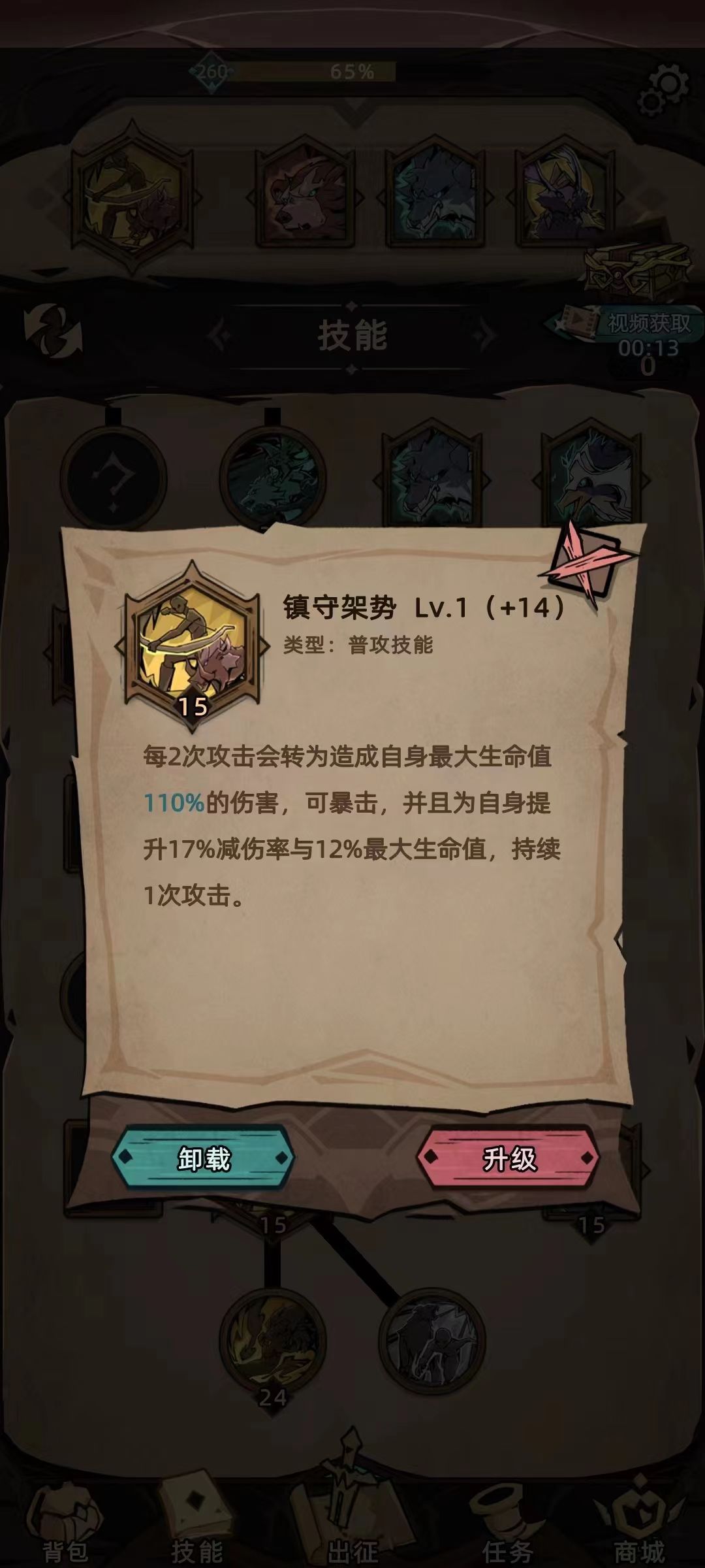 普攻选择镇守架势,加减伤和最大生命,保障生存