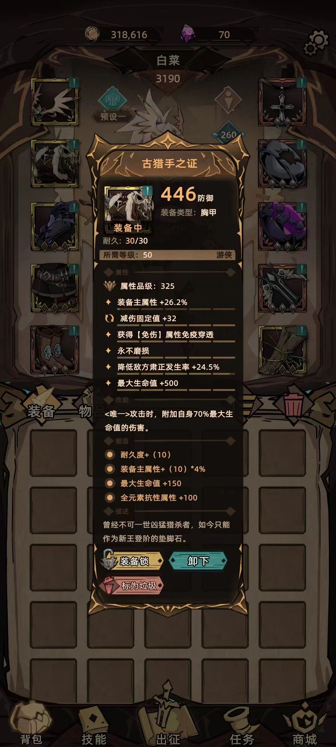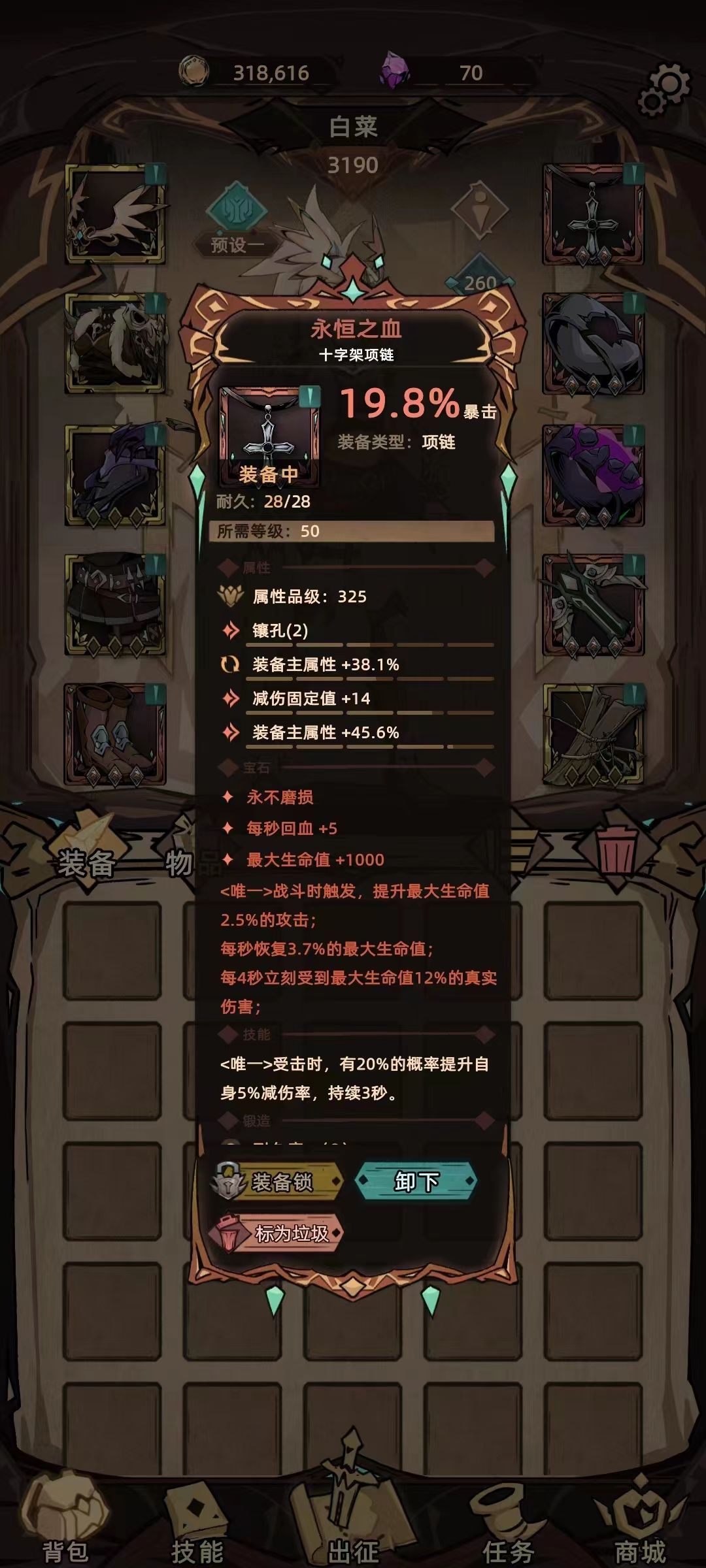 优先满足110肃正、100穿透、技能+15,有条件的朋友可以出两条吸血词缀