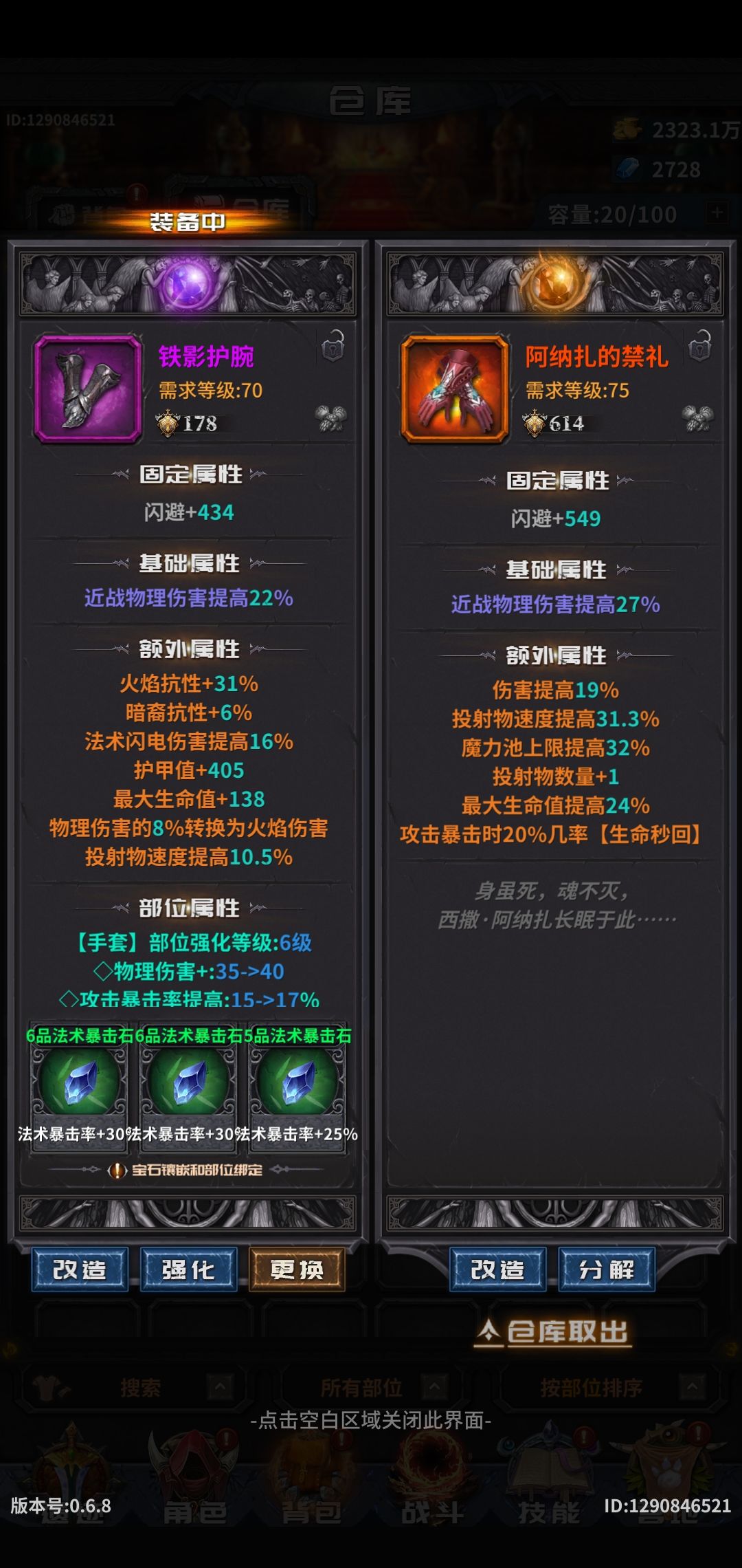 2改造,改造装备最好改造60以上的,60可以洗6孔,洗词条,好属性都是洗词条洗出来的,点改造后装备最下面会出现一排材料,每一种都有不同作用,可以每种材料点一下看看不同的作用。