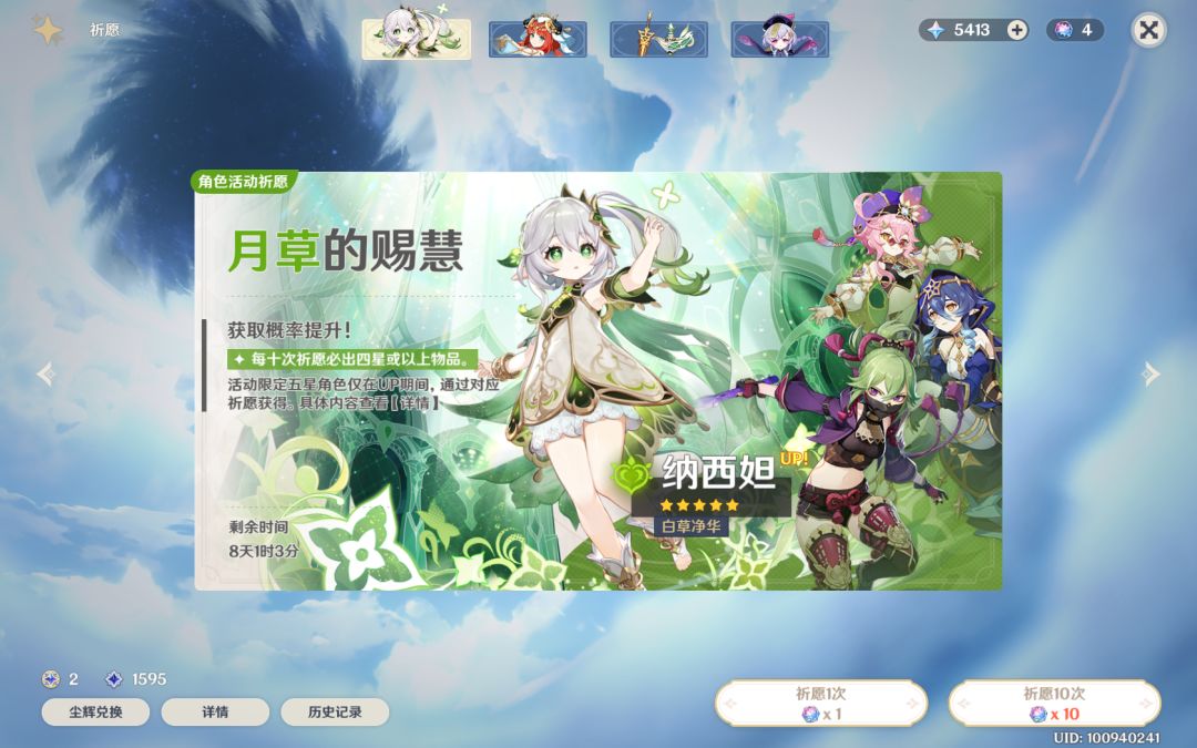 角色卡池:角色卡池5星角色是纳西妲与妮露,4星角色莱依拉,久岐忍,多莉,这2个角色卡池是相当不错的,两个5星角色直接就是水草反应队核心,4星角色也能作用与水草队或者激化队,对于新老手都是值得的。