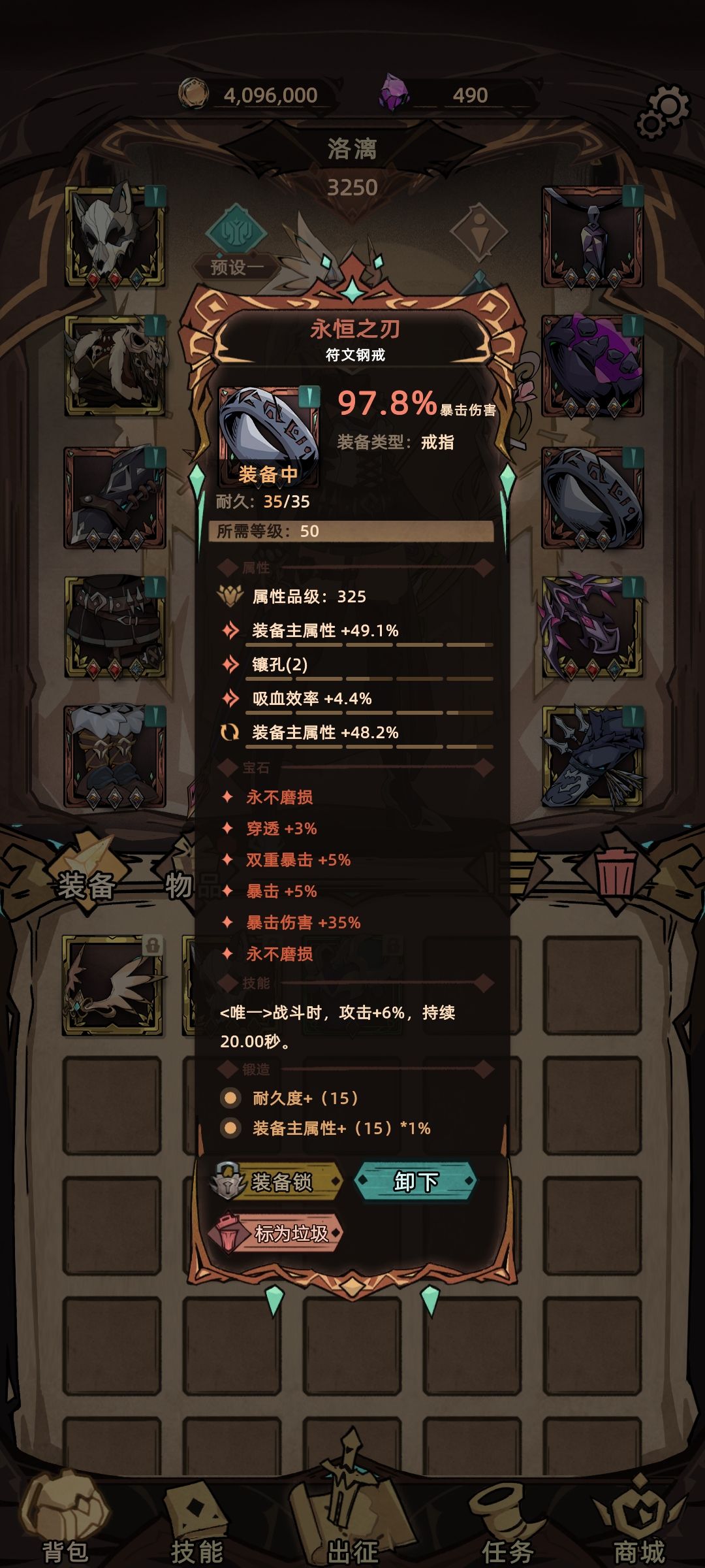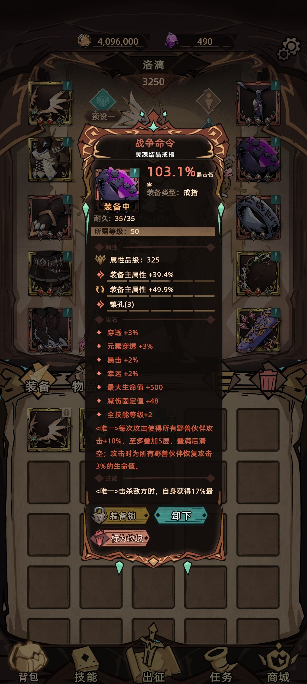 戒指一个永恒之刃,一个战争命令,毕业词条为三主或者双主一穿透。