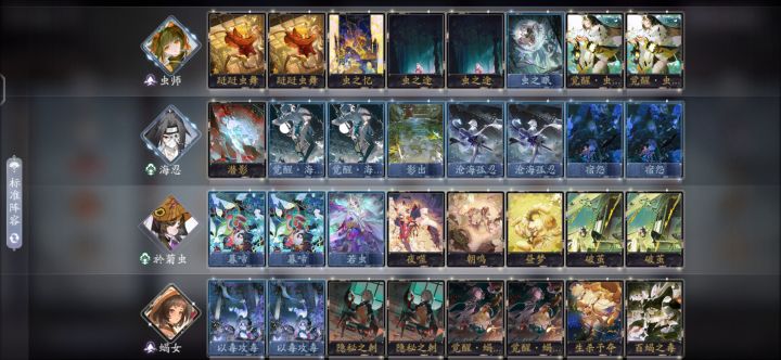 虫师:跹跹虫舞和虫之途是毒队为数不多的过牌,肯定是要拉满的。觉醒也是要满编的,这游戏觉醒是可以刷新被动的,所以觉醒完全可以当成是无消耗的解牌,而且觉醒之后虫师身材真的是大哥面板了。另外两个位置,我选择是虫之忆,稳定挂毒还是很不错的,复活卡其实我是不想带的,这张牌经常卡到地,别看他复活以为很好,但是毒队前中期节奏不多,提前复活也没事干,还可能有二次被解的风险,这张卡一般是三勾硬拍出来打一套的。所以我建议多带张打3好一点,提高上手率和一些操作点。