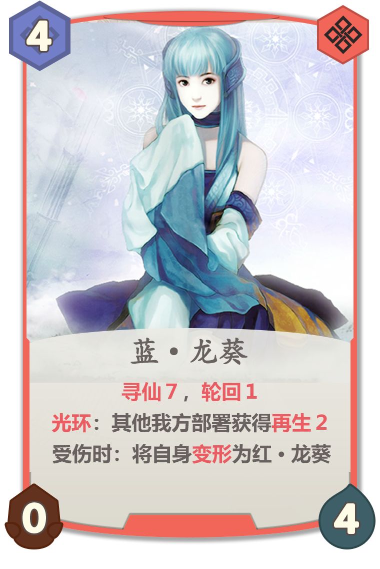 蓝葵没有战斗能力,因此设计攻击力为0;红葵每回合随机打是根据剧情里经常用雷咒。红葵并没有设计成衍生卡,可以单带红葵或各带一张。至于为什么寻仙7……无奖竞猜,有人猜得到么?