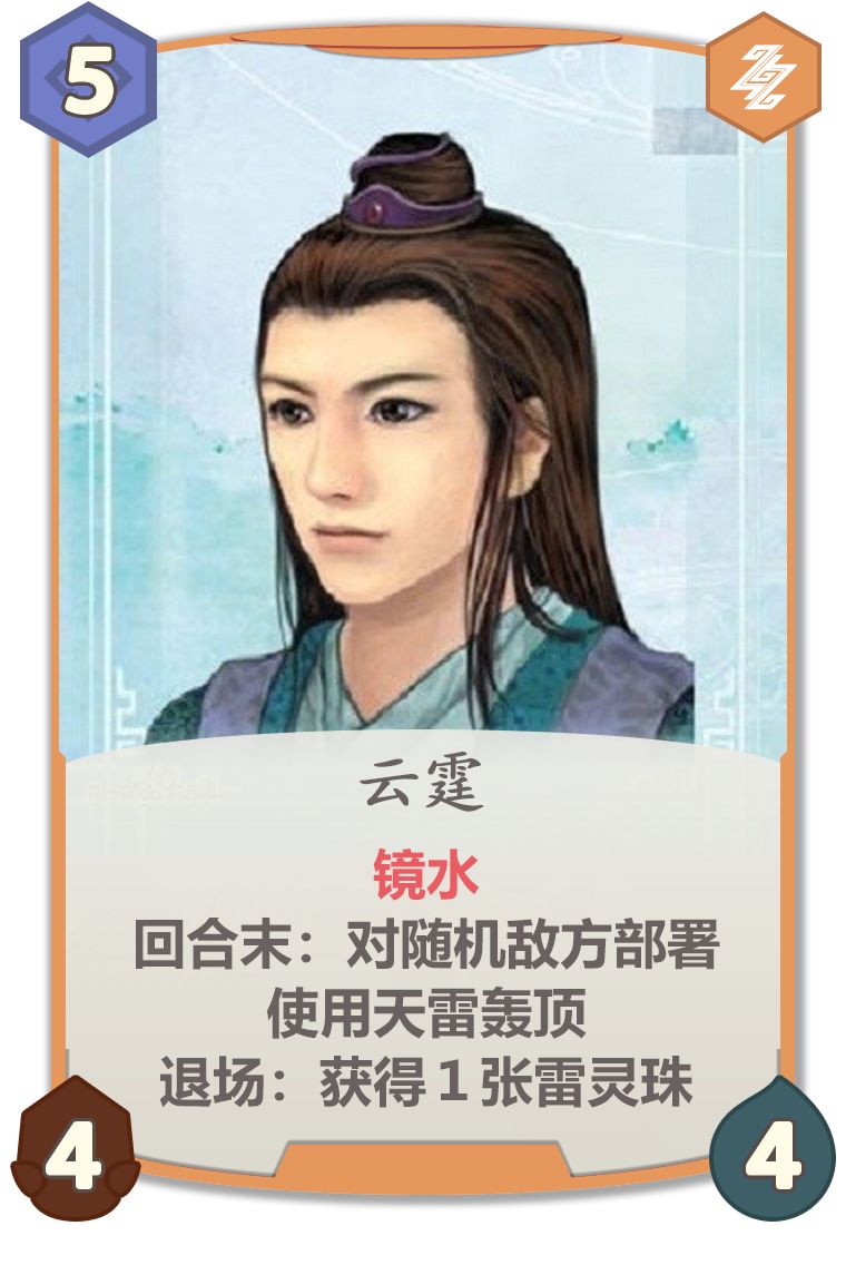 灵感来自特殊效果镜,经典99烟月神镜打重楼~回合末用天雷轰顶算用法术牌,但天雷不进坟场,能触发丹青等。话说丹青什么时候削!紫卡品质红卡强度,从没削过就离谱。