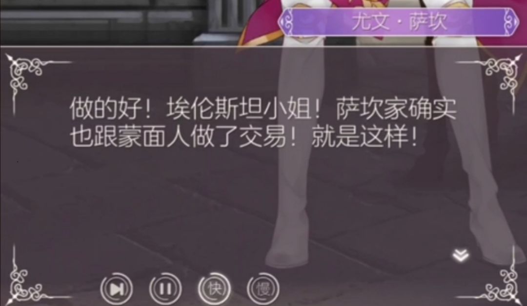 派发主线任务:散布【尤文半夜和神秘蒙面男人做交易】的传闻。通过尤文话中的“也”可知确实有蒙面人交易,那么为什么萨坎家要扰乱视听呢?
