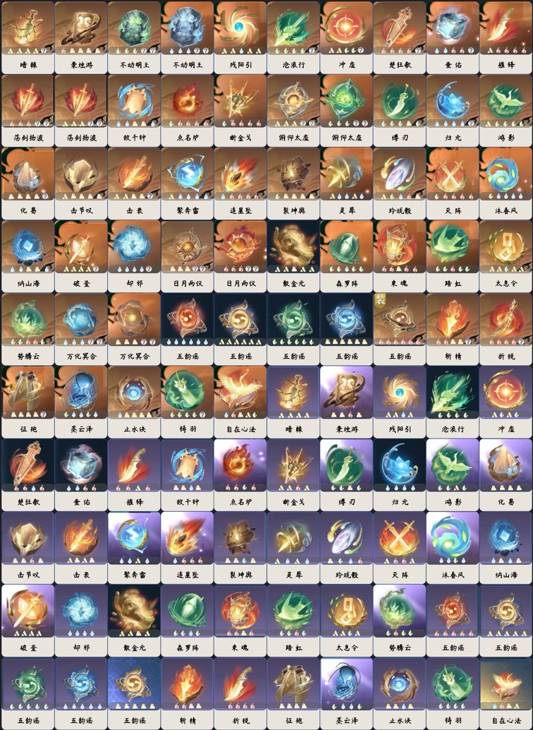 排除掉同种内功的【金紫红蓝】不同品质以外,有这么几个需要同名不同元素的内功需要大家注意的: