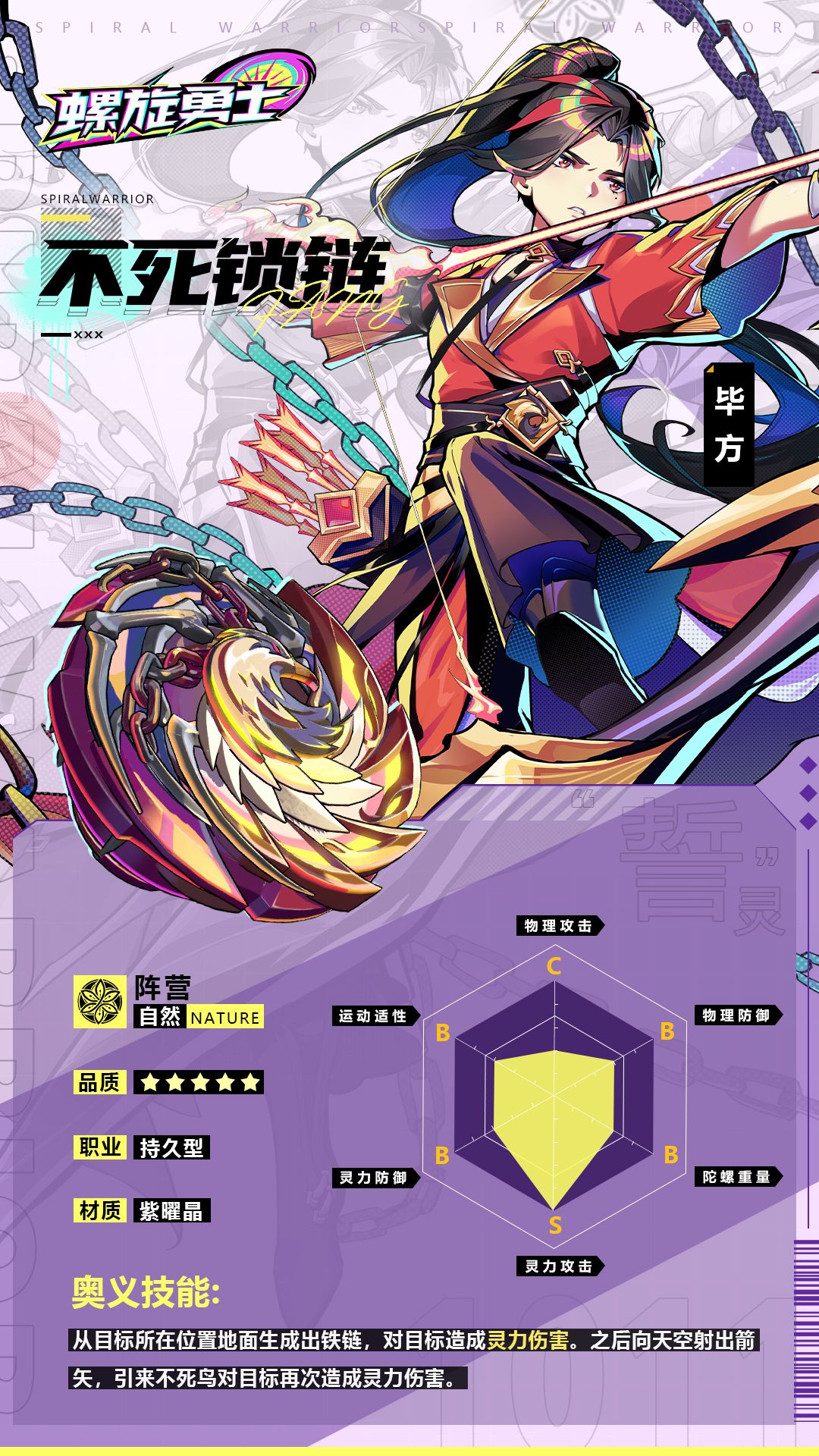 毕方是一位实力强大的誓灵,他帮助召唤他的陀螺手赢得一场又一场的比赛,不但是为了胜利的荣耀,更重要的是为了继续保护自己最爱的妹妹。