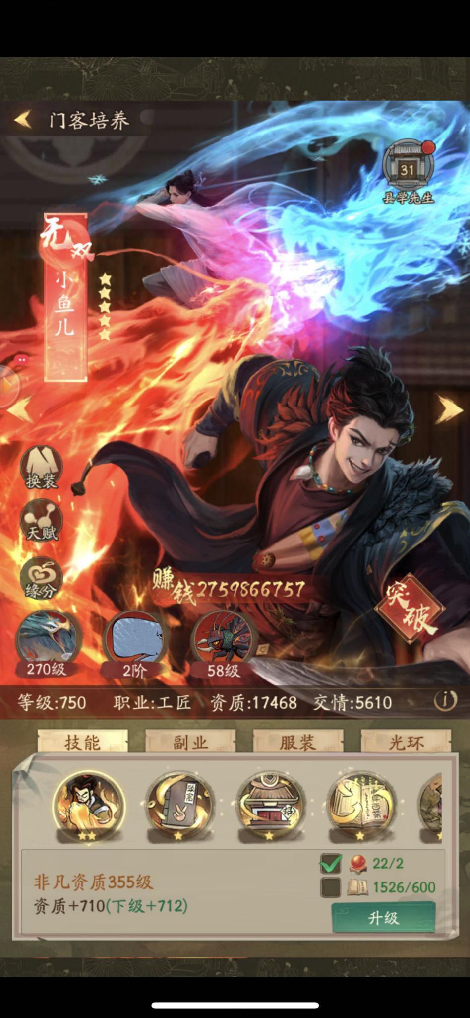 无双不叠皮肤的小鱼,目前是六件皮肤,每件皮肤400资质,共2400资质,十四星的初始技能,每个技能算350级吧,一半v7在180天初始技能等级是到不了350级的,取个整数,共4900,门客有数据波动的就这两样,其他的鱼和蛐蛐、精进等级所有门客都是相同的,这么看下来小鱼会波动的资质是7300资质。