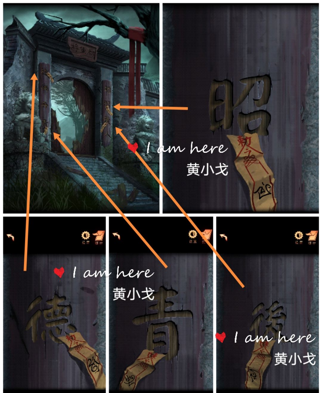 4.点击石狮子上面的机关,根据牌匾上的纸符线索,把字滑块调整到对应的符号下方的凹槽处(德青昭后)