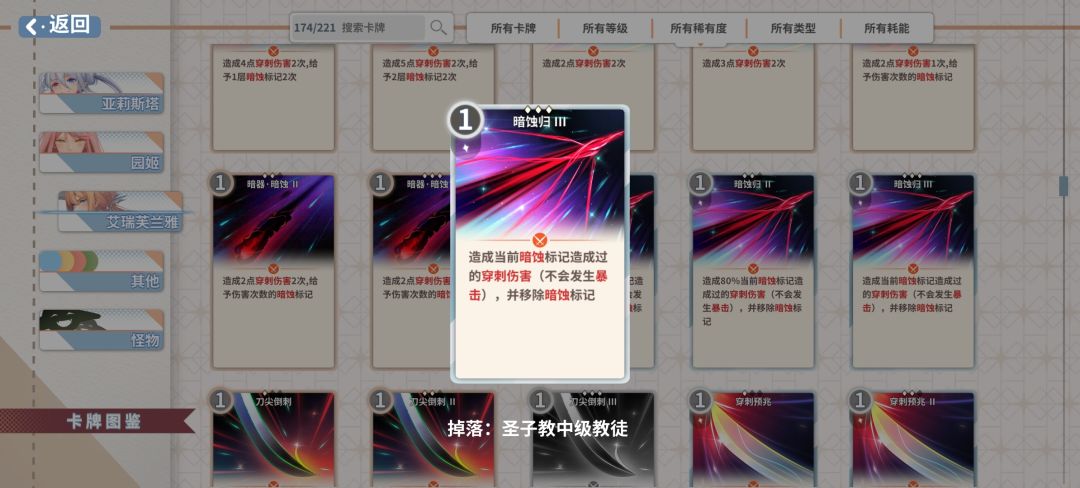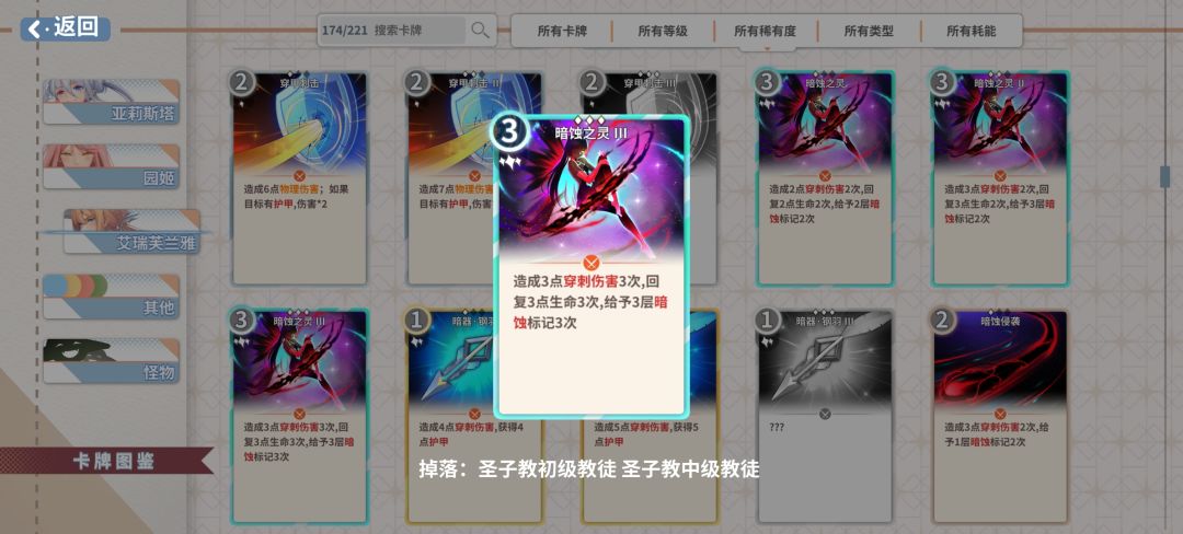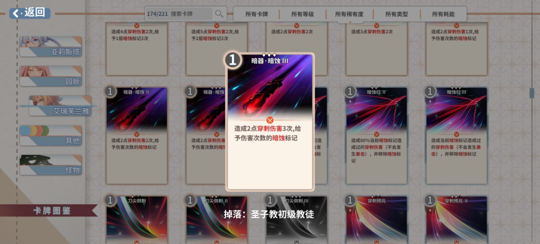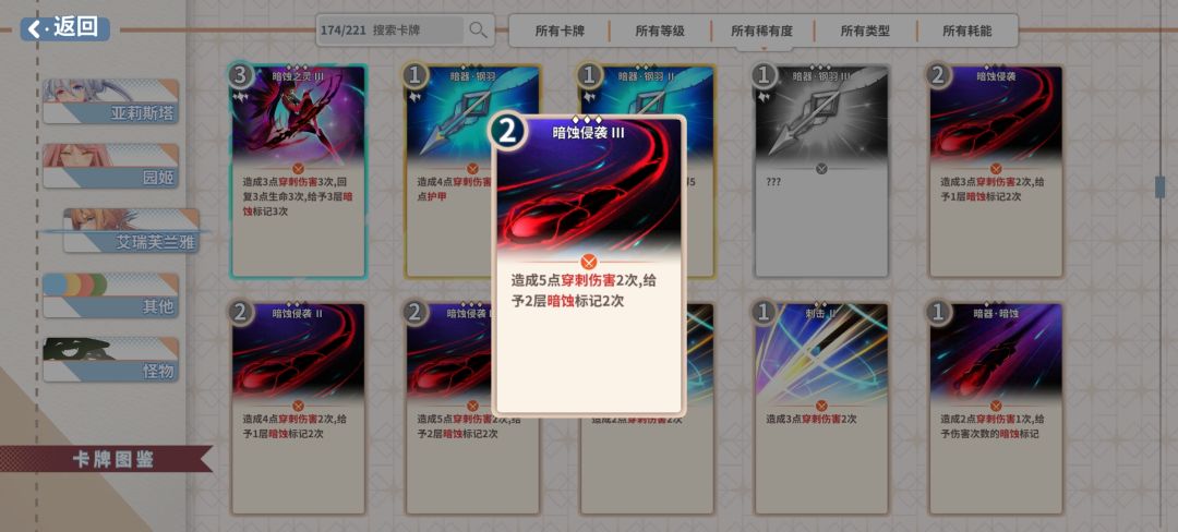 牌序:灵动迅捷—灵动迅捷—暗器暗蚀—暗器暗蚀—暗蚀侵害(5张牌4费)