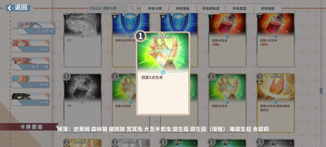 低费1级可回3血,其他带回血的卡都可以挂,怪物掉落较多,应急时候可加进卡组,通常情况升级回血和任务后旅馆休息回血是足够的,不够还可以吃捡的回血药剂,只要普通怪不要刷太多(指地图蓝色怪物和绿色怪物)。费用低不容易卡费。