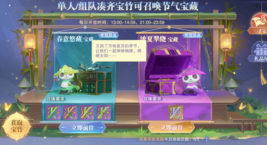 首先这个活动的兑换币来源就是这个类似于去年中秋活动的宝竹活动,其中春意盎然和浓夏翠绕大家应该这两天也有所体验了,考虑到这个活动中的福袋奖励是看大家的唐门荣誉等级来决定领取上限,所以我们也很难去给到大家一个非常准确的每日获取成本,不过以维一为例,两天活动都搞满紫竹和5个互助金竹,目前大概收获的兑换币也就1.3万左右,所以想要换到一些比较高阶的资源,使用钻石购买金竹和氪金可能还是必须......的途径。
