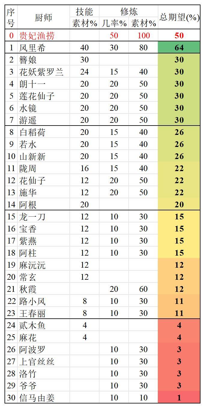 接下来就是非常规操作,说到厨具,就不得不提起一个厨师,无限,修炼效果为:厨具效果翻倍,而无限佩戴该厨具的效果为:全采集+8,50%概率额外获得200%素材,即期望为100%,下面让我们看一下豪华鱼塘对比