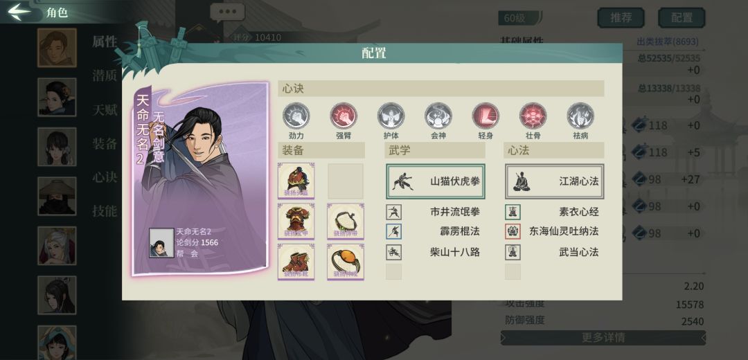核心武学和心法:门派武学、江湖心法(有足够精参研的可以换成当歌诀,剪刀石头布换成疾风迅雷剑)