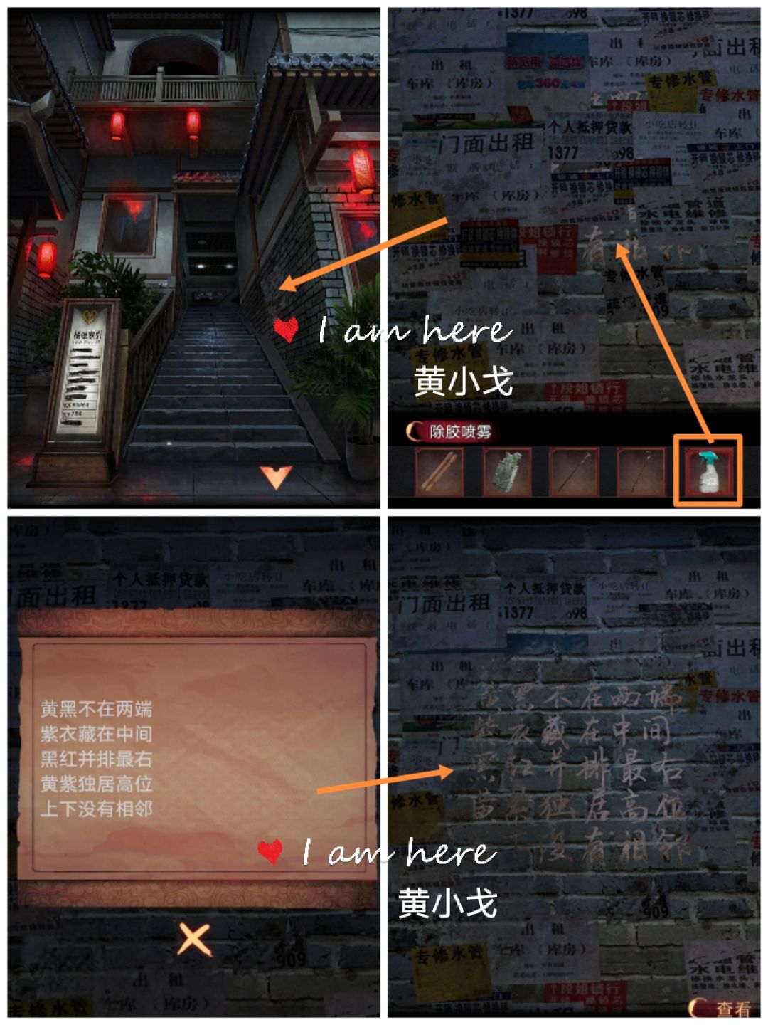 6.(楼梯口)点击右边的墙,用【除胶喷雾】喷上面的广告,获得线索(黄黑不在两端、紫衣藏在中间、黑红并排最右、黄紫独居高位、上下没有相邻)