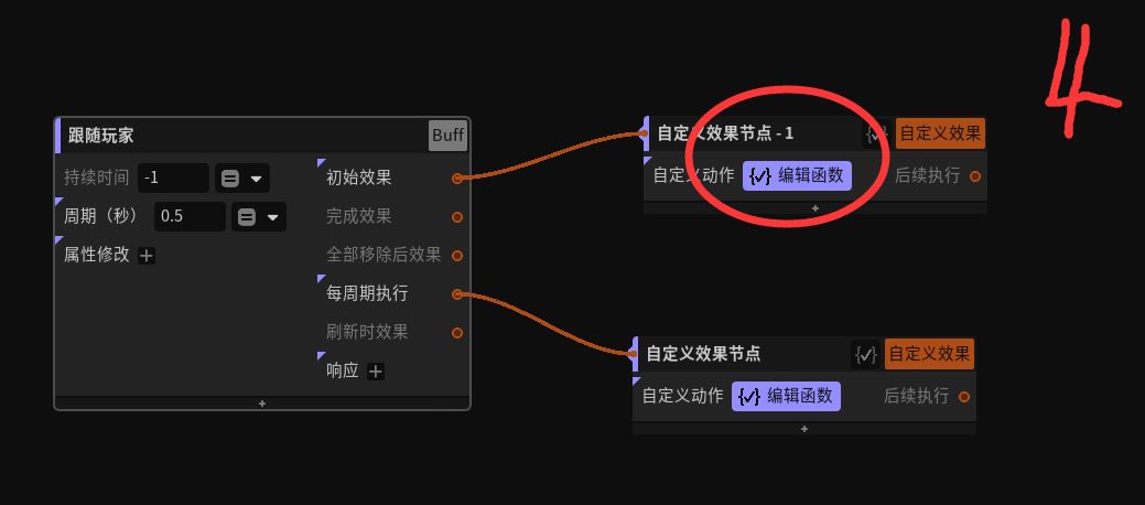 第二步(图4、5),创建一个Buff (0.5s执行一次),初始效果 的时候,把 队列从 主角上取出来,把队列最后一个节点,挂到 Buff 的所属单位上,作为这个单位要跟随的目标。同时,把当前Buff单位 更新为 跟随队列 的新的最后一个元素。