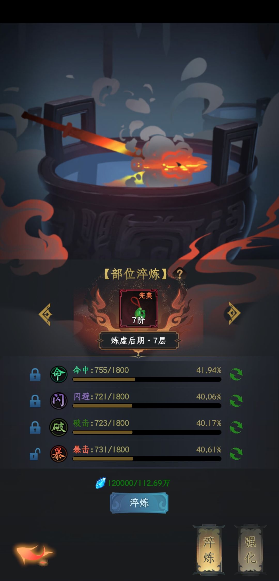 淬炼小技巧,数值升到720消耗零食会增加到双倍,这边建议720就升其他属性,6个装备等到了战力榜结榜会至少每个装备3属性,18个属性每个720提供战力数值可观的。