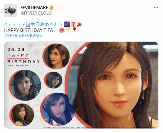 根据官方设定,蒂法于1987年5月3日于尼布尔海姆出生,所以今天也正好是她36岁的生日。