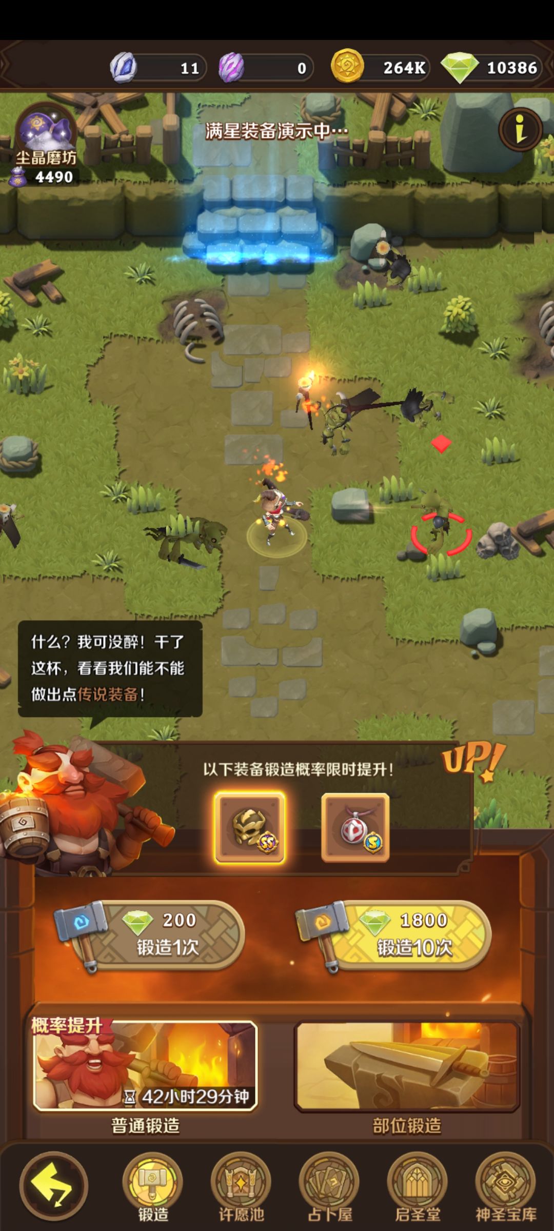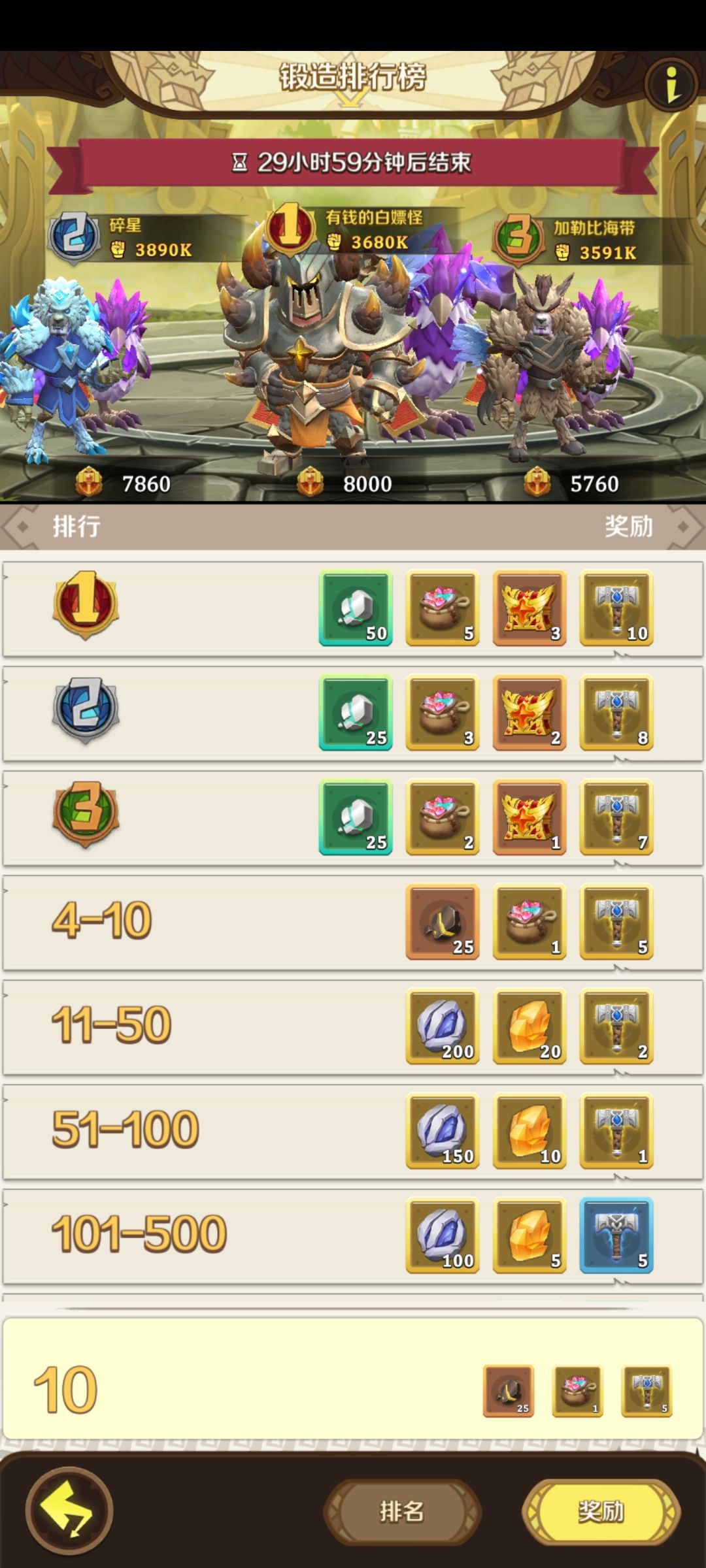 如图,游戏前期我们能获取大量的抽装备的材料,锻造又分普通锻造和部位锻造,分别是蓝色和粉色材料,对于弓箭手玩家来说,我个人建议是前两天尽量屯材料别抽装备池子,因为开服几天后普通锻造会更换up装备,而第二次up装备就是我们的前期核心武器火弩,我们把蓝色材料屯着,等火弩出来多抽几把升星,这样前期就很容易过渡了。