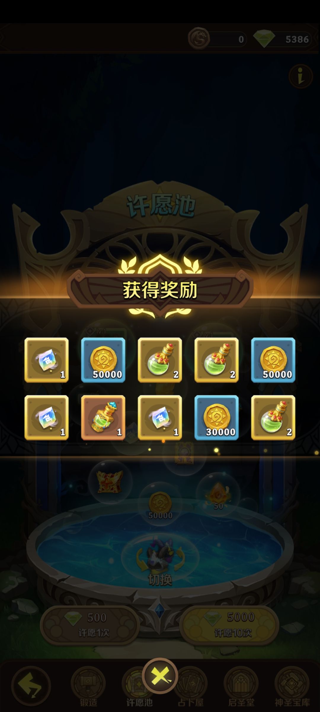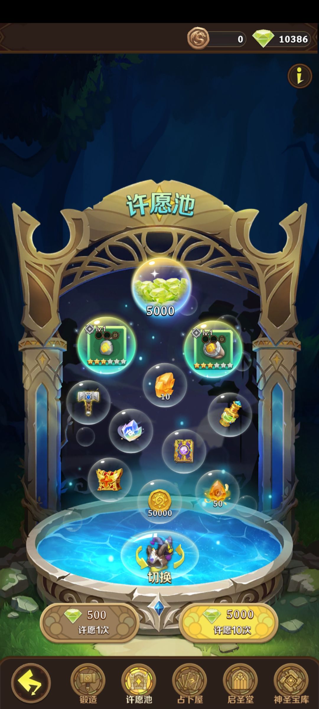 许愿池可以获得套装,是游戏中后期的核心,但前期普通玩家真的不要碰这个池子,5000钻石一抽,大概率是一堆垃圾,而且没有保底,真的,别把钻石浪费在这上面,真的蠢!!官方赶紧改!!