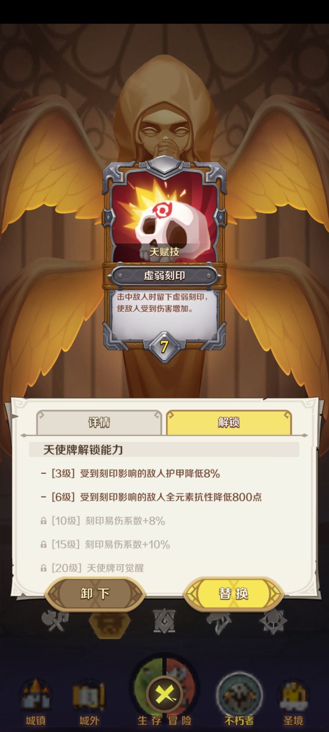 虚弱刻印主要是白色天使牌性价比高点,容易升级,适合前期过渡用,后续等别的橙色天使牌等级高了可以换过来