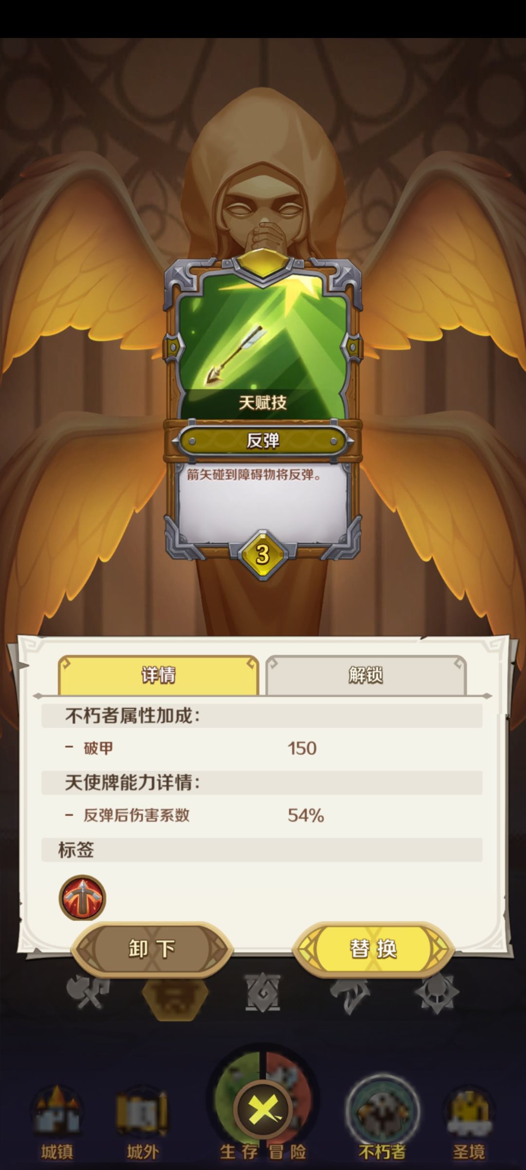 天使牌的选择的话,除了必带的潜行和暗影迷踪两个保命技能,我还推荐反弹和虚弱刻印,反弹箭矢在我看来是弓箭手的核心,当有了这张牌之后,正常刷图选择散射和齐射这种增加普攻的就行,无脑走a。