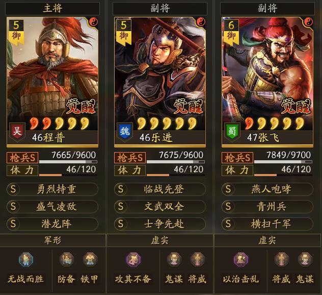 关于另一名副将上谁,其实之前也做了几个不同的尝试,关羽、马超、赵云等都上过场,相比较而言,张三爷是几名蜀将中输出最稳定的。没上小关的原因,一来她在三势骑兵中做主将(三势关银屏有单独成文介绍),二来也会浪费潜龙阵激发副将的主将技技能。当然,乐进没有主将技也是遗憾之一。战法搭配上,程普更适合的是草船借箭,不仅能回血,关键是能为乐进解控负面影响。可惜该战法成本较高,作为走过9个赛季零氪的我,依然望尘莫及。其间,也试过挫锐、益其金鼓、一力拒守等,效果都不理想。