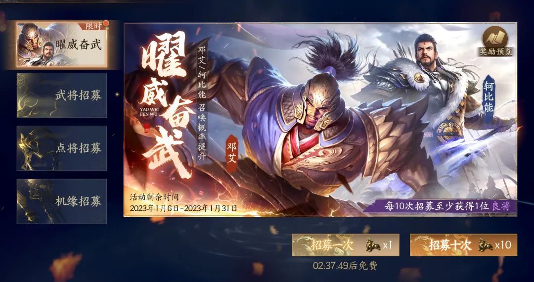 限时卡池“曜威奋武”现已开启,邓艾、轲比能上线!活动持续5天,想招募这两位名将的主公们可要抓紧时间了。