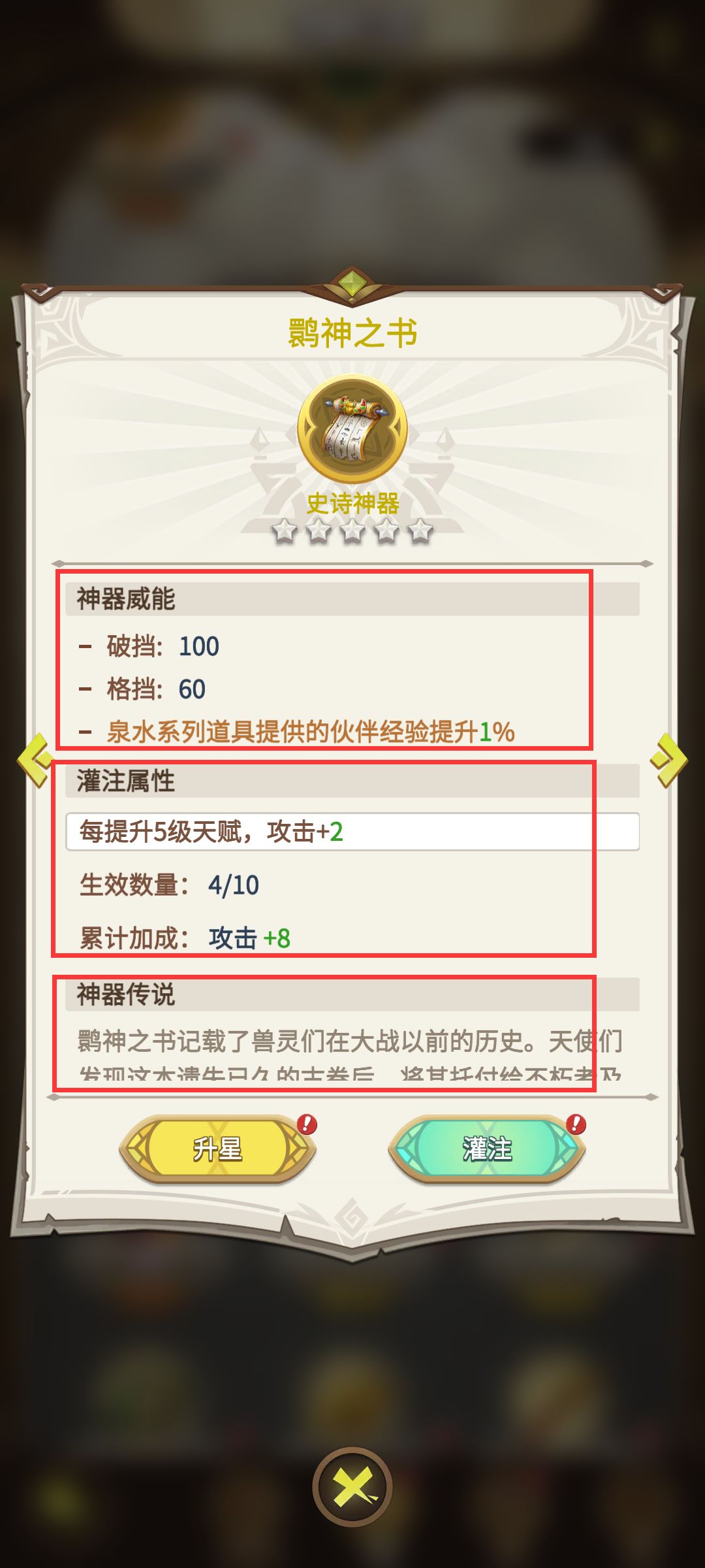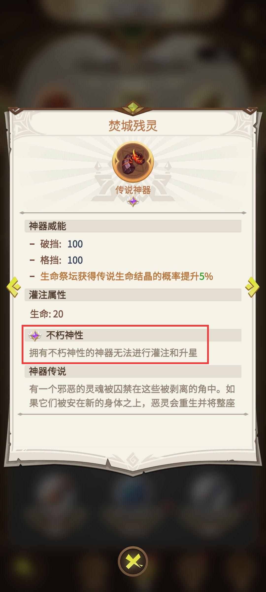 不同的神器灌注属性不一样,同样会提供各种效果,但是有部分神器拥有不朽神性的词条,无法进行灌注和升星。
