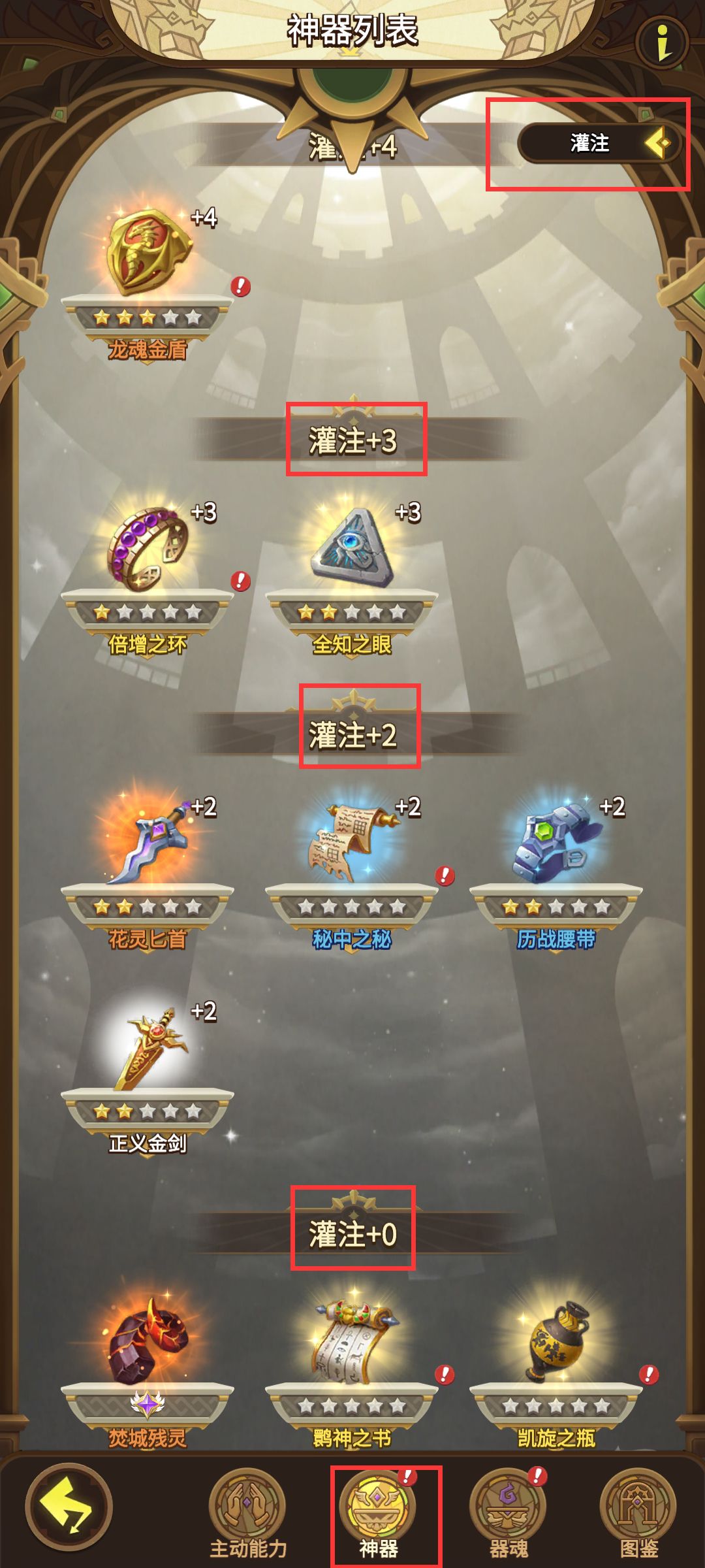 因此,在资源有限的情况下,平均升级的收益更高,同时玩家可以根据属性区分灌注的优先级,点击神器列表的排序栏,选择【属性】排序,即可看到各个神器着重提升的属性是什么了。(根据灌注等级来的玩家,也可以选择按【灌注】排序,更容易把控各个神器的灌注等级)至于升星,则推荐先优先升星有主动能力的,其次是神器威能是自己所需要的那种,若是抽的不多,只有几个神器,则优先培养拥有最多器魂的神器。