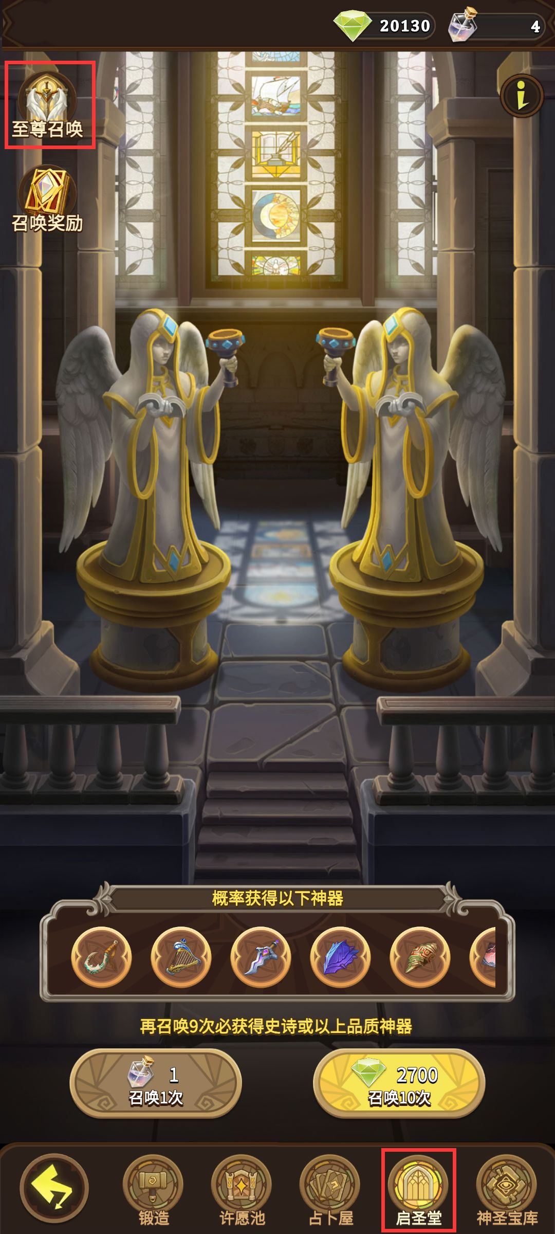 神器可通过【抽取-启圣堂】召唤,有概率召唤到神器器魂和神器,召唤到的重复神器会自动化为神器器魂,可用于神器升星。完成传说召唤后,会积累召唤进度,达到对应目标即可获得相应的特殊「灵石」,使用这些特殊「灵石」可以开启【神圣宝库】中对应的“界”,就有概率获得特定神器。