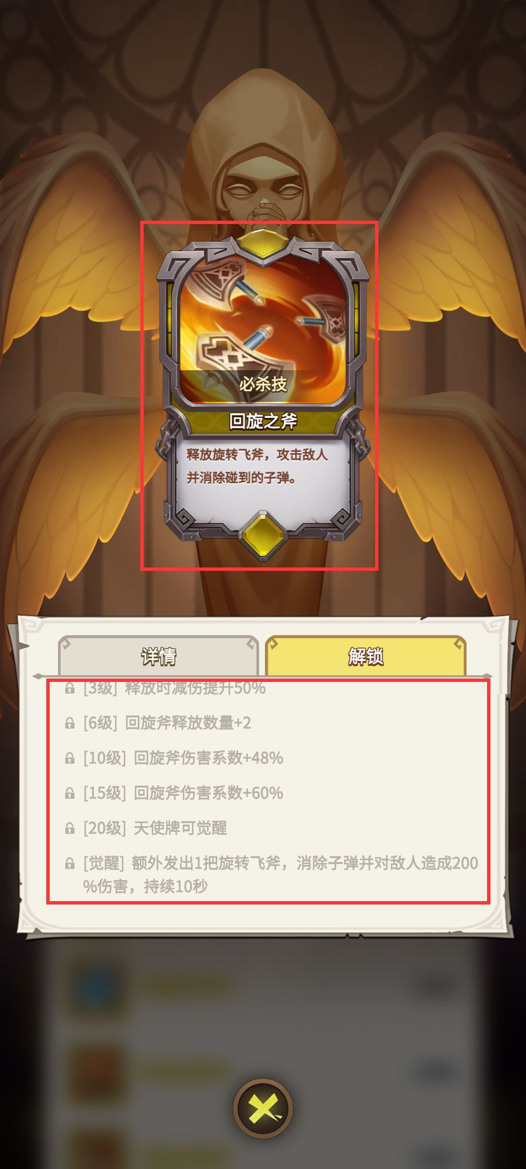 野蛮人的必杀技是回旋之斧,释放旋转飞斧,攻击敌人并消除碰到的子弹,升级后可以提升效果,最终在消除子弹的同时对敌人还造成伤害;他的守护技是先祖铁卫,释放雷光罩抵挡所有飞行子弹,并持续发射光波攻击前方敌人。这两个技能都是增强野蛮人防护的技能,不过由于需要能量,建议大家还是练好自己的走位,这样才能更好地玩转野蛮人。