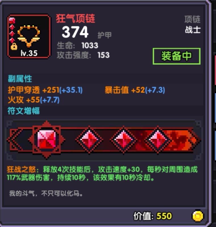 之后35级装备买超级暗金第一行必出橙属性,属性优先要暴击和穿透 剩下一个洗火攻(爆伤也可以),戒指和项链有三个攻击属性,其它位置都是两个(攻击属性都洗橙就毕业啦,剩下一个防御位置如果是生命更好)