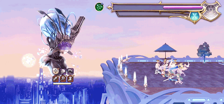 双人疗愈:自身及右边队友HP最大值↑1500(5回合)+恢复异常+属性/攻击阵展开时 自身及右边队友获得治愈效果(固定恢复2000HP/5次)+ 如果自身排在第四位置 则会给第一位置队友增益效果