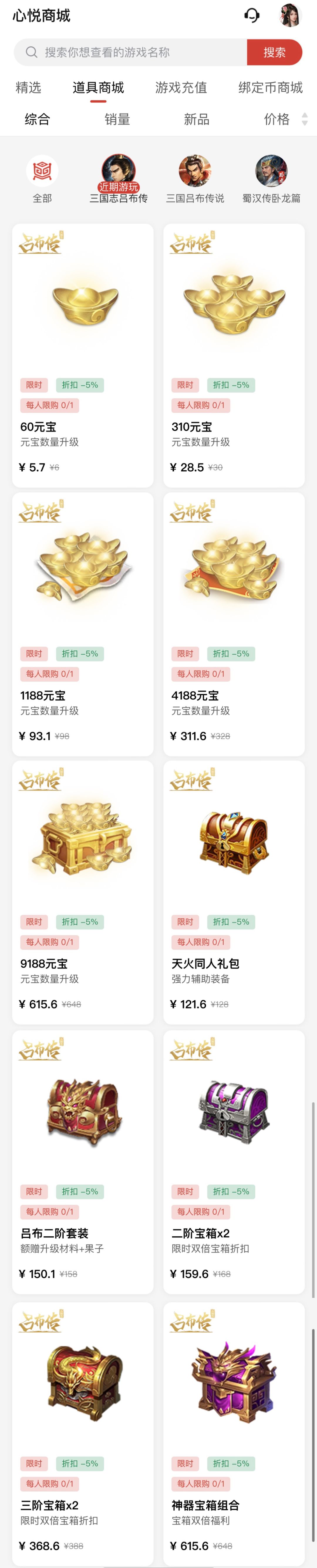 在心悦商城中-点击[道具商城]-选择[三国志吕布传],即可查看到以下内容