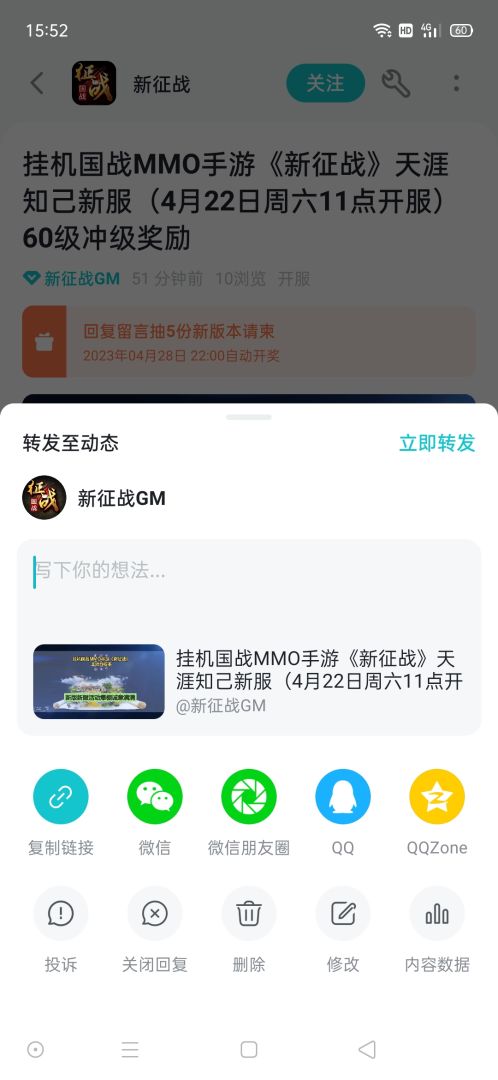 《新征战》资讯转发动态方法:点击资讯页右上角的两个点—转发至动态的输入框内加上:挂机国战MMO手游《新征战》新版新服活动爆棚诚意满满,22号周六11点新服天涯知己然后点击“发布”