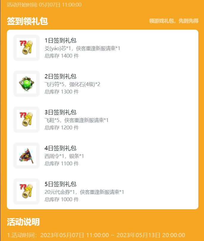 5月7日-5月13日期间签满5天即可领取全部奖励