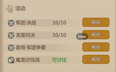 军团决战:根据龙宠的规模是要系统兵力进行战斗,排名奖励很丰厚,越早打上去越好,后面可以与盟友商量下兵,打到第一兑换皮肤奖励 之后日常选择能打过的玩家就行,高打低获胜排名不会有变化