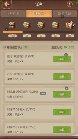 除了以上必做内容以外,每日任务也是一个必做的内容,点击前往就可以完成,这里就不跟大家过多赘述了小Tips:其中训练兵种的任务是领兵的时候结算,大家可以提前造好,每日刷新之后领取即可完成,采集任务也是挖矿回家结算(需要算好回家的时间)积分宝箱给的体力行动力直接到面板,超出120上限则无法自然恢复