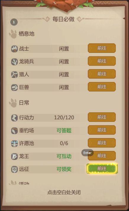 每日必做游戏里已经有很好用的功能了,大家在游戏内点击左侧的提升栏位与符文页,就能比较清晰的知道那些玩法与活动是处于空闲状态并且可以参与了栖息地