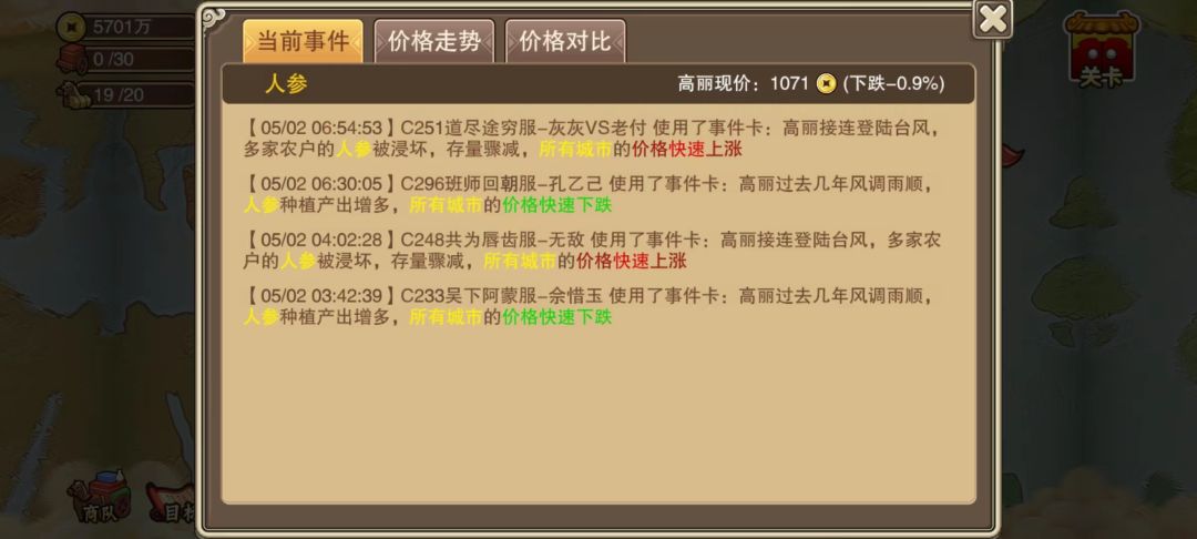 ③我们在进行选择时,也可先利用事件随机卡(可利用小号配合)来刷出我们想要的价格曲线(需要运气)。