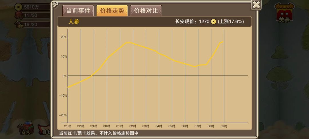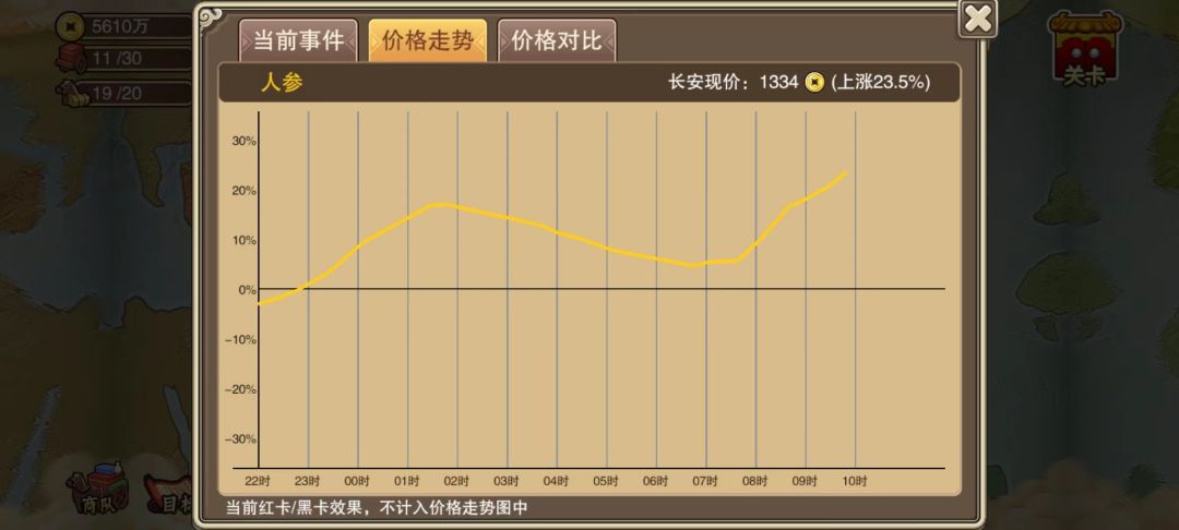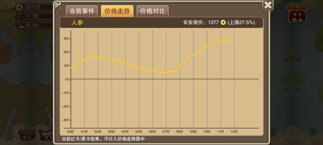 ④11点开始,人参开始出现饱和,此时即可进行出售,当然如果其他城市的价格曲线更高,也可前往其他城市抛售。