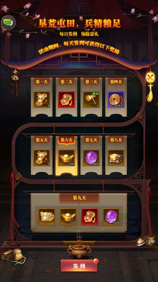 活动内容:星荒屯田,兵粮精足;活动期间每日登录签到,海量离线收益,欢乐豪礼领不停!更有活动专属限定聊天气泡—百战精锐,等你来拿!