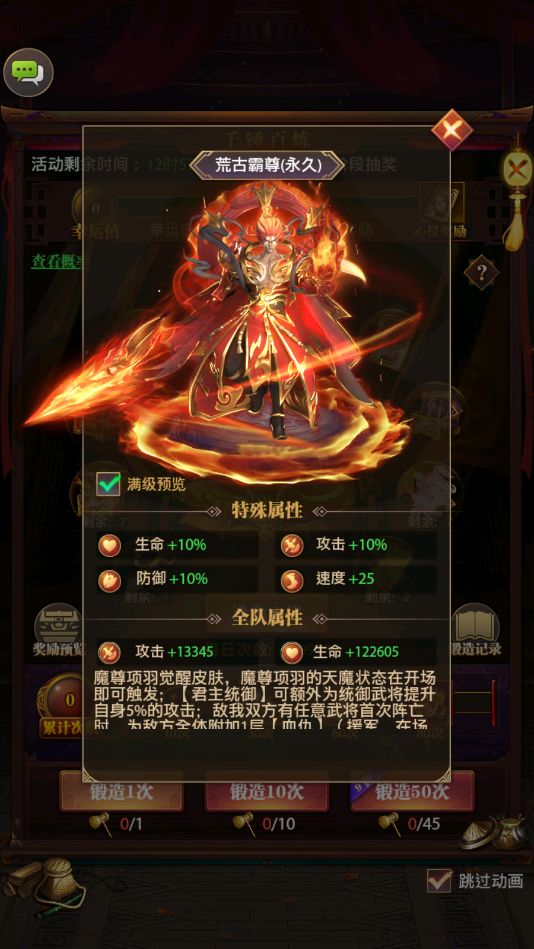 活动内容:活动期间,军备购置-锻兵宝锤,抽取您的心仪皮肤,此次奖池加入魔尊项羽最新觉醒皮肤—荒古霸尊,更有魔关银屏,神张飞等觉醒皮肤限时返场,实装后即可大幅提升武将战力,同阵营战力飙升更明显!