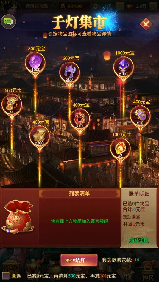 活动内容:活动期间,铸魂进阶石,铸魂精魄,战马锁定石,百炼玄钢,夺宝令,聚贤令等各种珍稀材料于集市打折特卖,多买多送,买得越多满减约省。