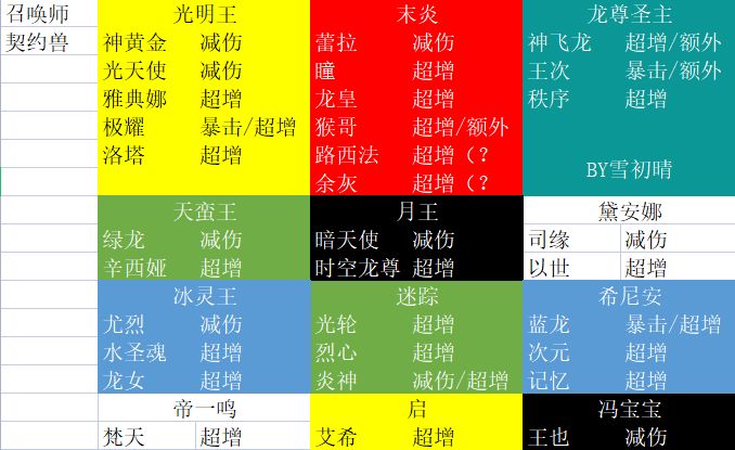 只列了平时用的多的召唤师及契约兽与其契约技能