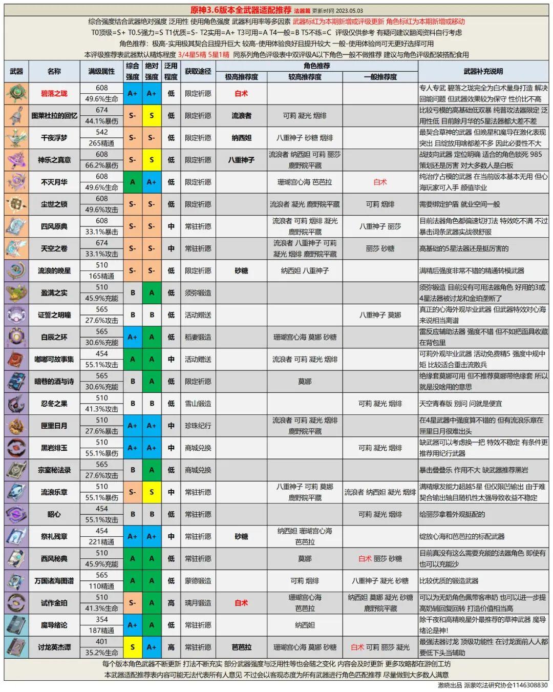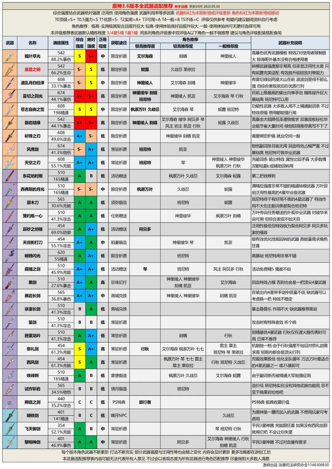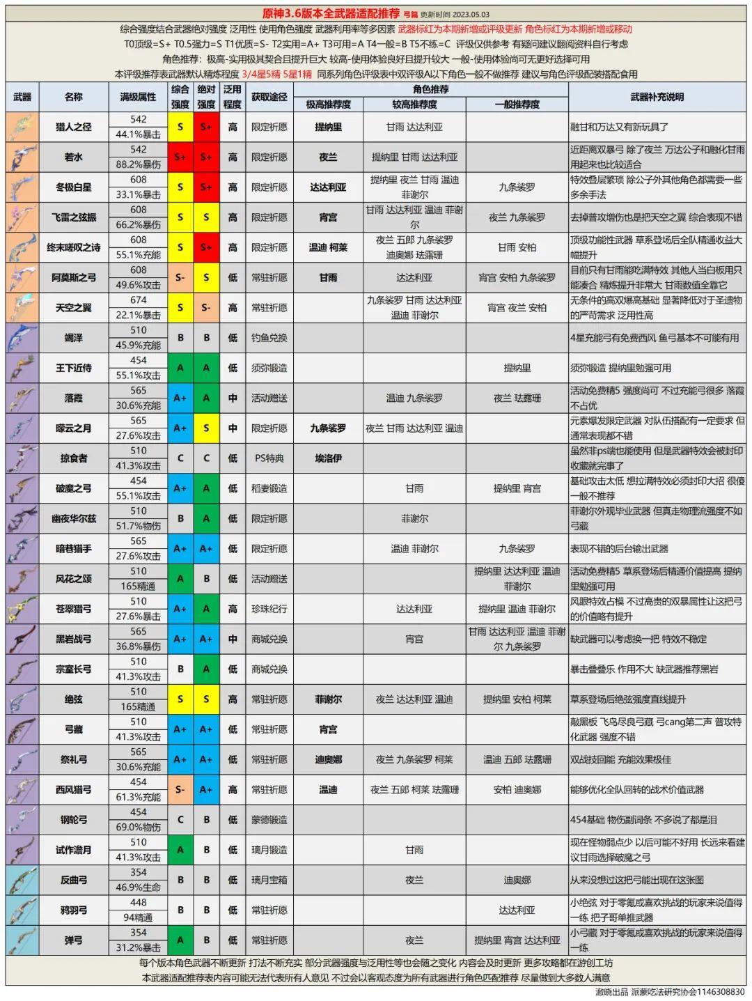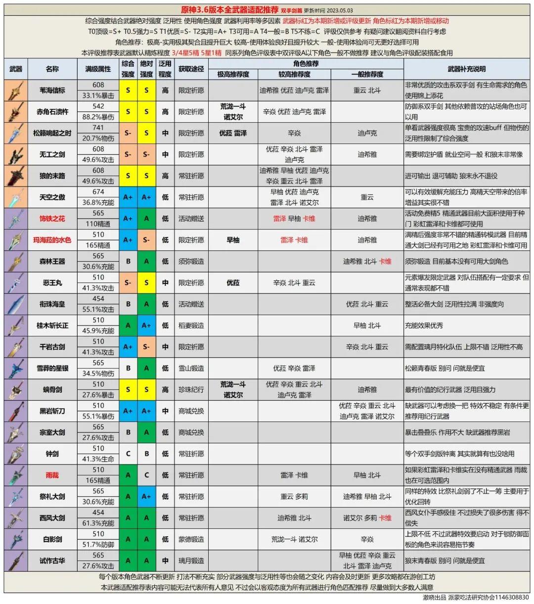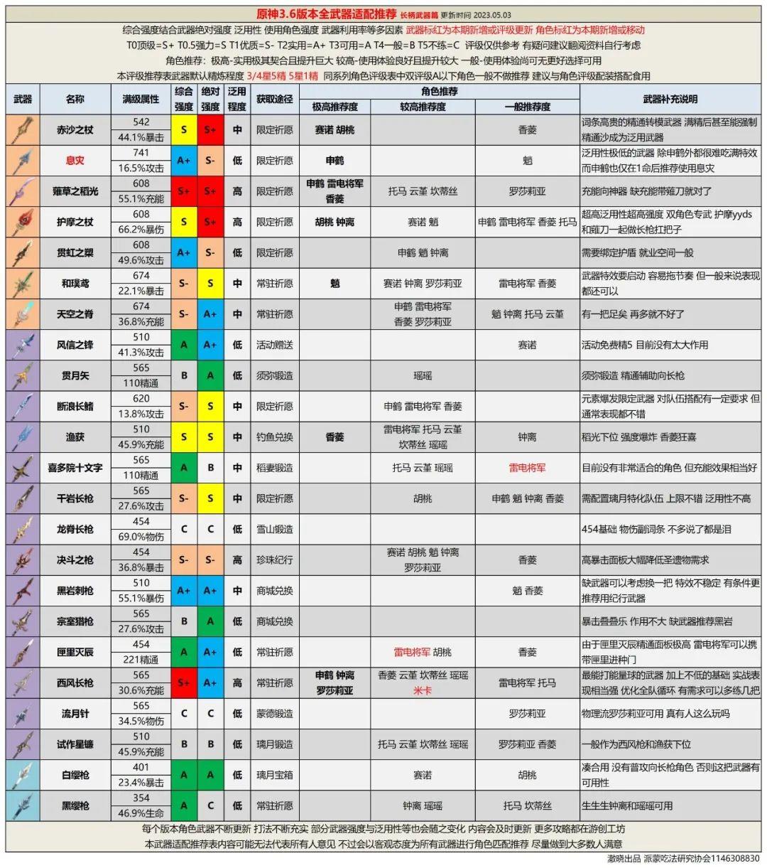 全武器评级推荐能够方便旅行者们分配现有武器,并为未来做一些武器抽取规划。另外为配平成本,武器精炼统一为5星武器精1、4星武器精5。
